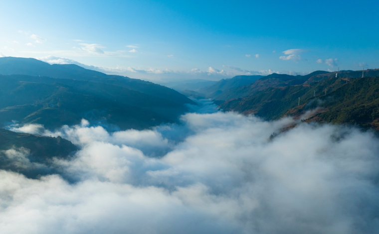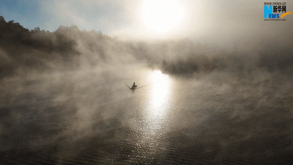清晨,在云南省保山市龙陵县蚌渺湖,初升的暖阳穿破薄雾,照向湖泊,水天一色,宛如一幅水墨画卷。