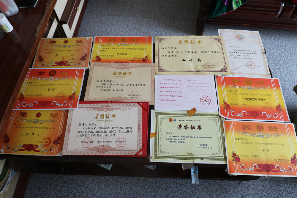 女儿马曾于获得过的部分奖状(7月11日摄)。李志旭 摄