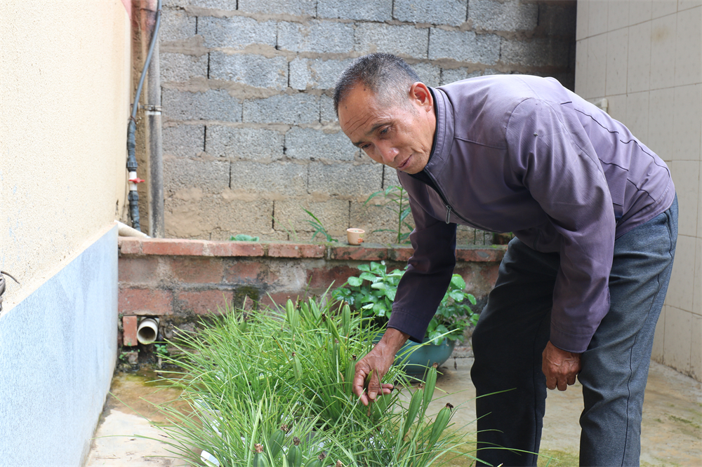 于建荣的父亲在家里摆弄兰花(7月11日摄)。李志旭 摄