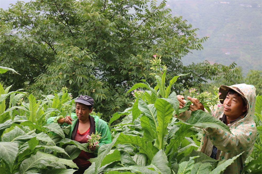 于建荣夫妻俩正在进行烟株封顶打岔(7月11日摄)。李志旭 摄