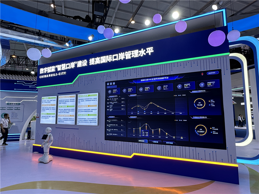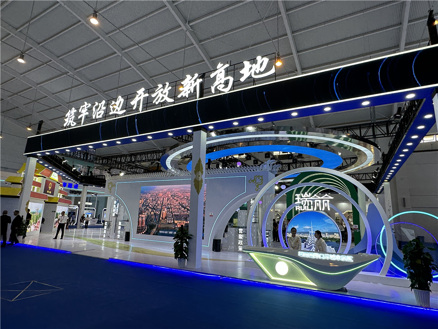 在德宏州口岸经济馆展位中,各类富有时尚科技元素的大屏,实时展示着德宏州数字赋能“智慧口岸”建设,不断提高国际口岸管理水平的成果,呈现着德宏州外贸发展的新动能,一幅幅德宏州服务国家发展大局的兴边绘卷徐徐展开。