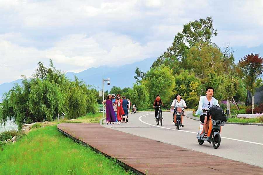 在洱海生态廊道,“绿道+”模式将洱海月湿地公园、海舌生态公园等众多绿色空间与传统村落、田园美景连接在一起,将绿道编织成绿网。来到这里的人们不仅可以近距离欣赏迷人的苍洱风光,还可以开展丰富的户外休闲娱乐活动。如今,洱海生态廊道已成为大理的城市名片,实现了从“廊道生态”到“廊道经济”的转化。自2020年9月洱海生态廊道建成投用以来,进入洱海生态廊道的居民和游客已超过1800万人次。