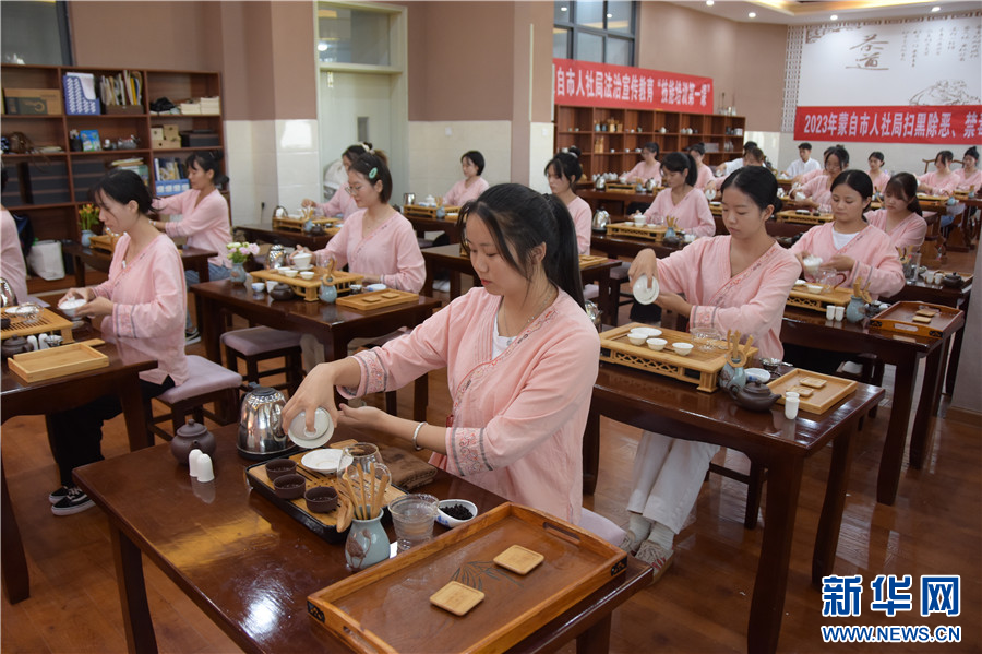 在茶艺实训室,学员学习茶艺课程(10月22日摄)。新华网发(薛莹莹 摄)