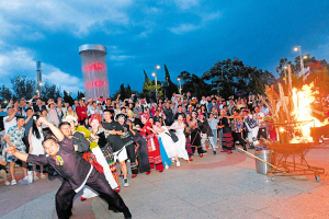 “月亮出来么亮汪汪,照着阿哥么心慌慌……”在云南山歌《三跺脚》的歌声中,云南各族演员、全国各地游客围着篝火,欢乐打跳。5月19日晚,昆明市在云南民族村举行“5·19中国旅游日”公益展演,这也是“有一种叫云南的生活——云南舞蹈大家跳”“四季打跳”昆明首场演出。