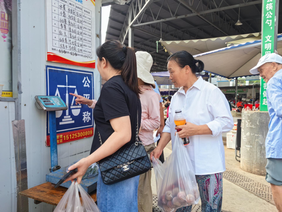 每天一大早,永善县玉泉农贸市场就热闹起来,摊位上果蔬品类繁多,前来采购的市民络绎不绝。在农贸市场入口醒目位置摆放的公平秤前,不时有市民将刚买的蔬菜放上去复秤。