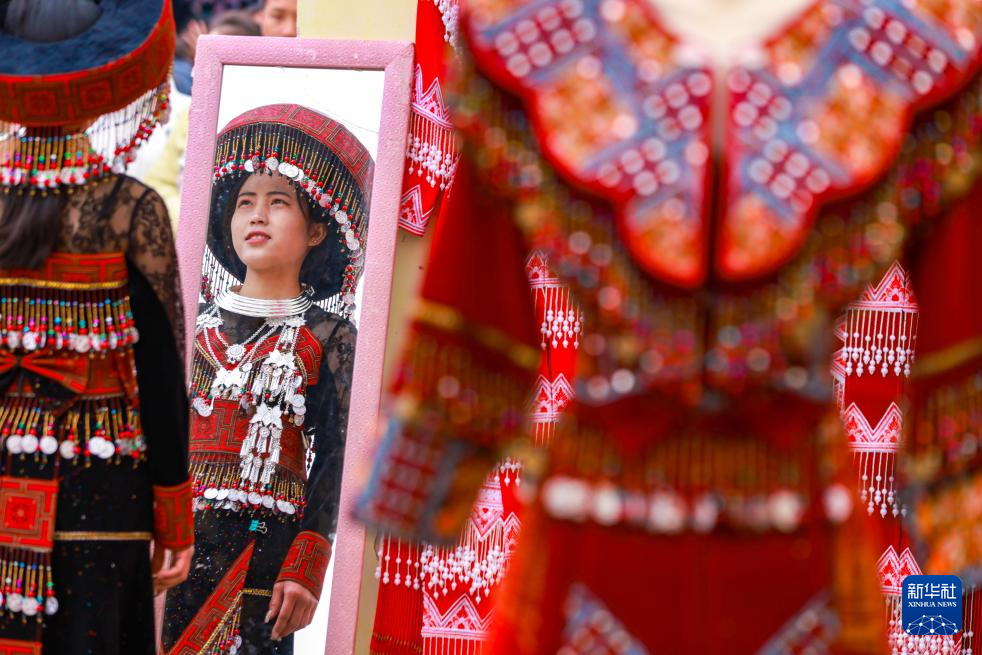 1月19日,在云南省红河哈尼族彝族自治州开远市的苗族集市上,少数民族群众在试穿新衣。