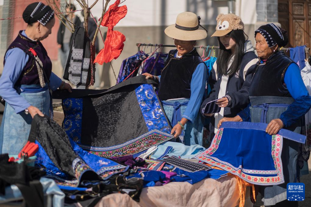 1月21日,在云南省大理白族自治州洱源县凤羽古镇年集上,当地村民挑选新衣。