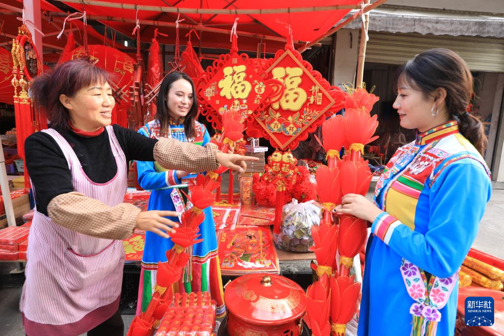 1月21日,在云南省腾冲市猴桥镇集市上,当地傈僳族居民在选购春节饰品。