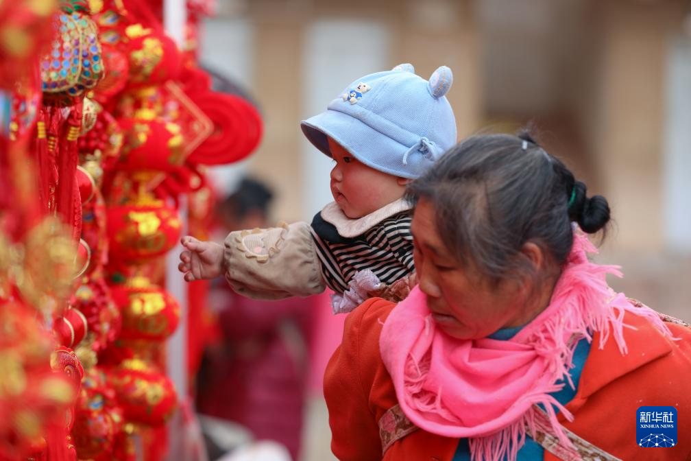 1月21日,在云南省曲靖市陆良县芳华镇乘明村集市,人们在选购春节饰品。