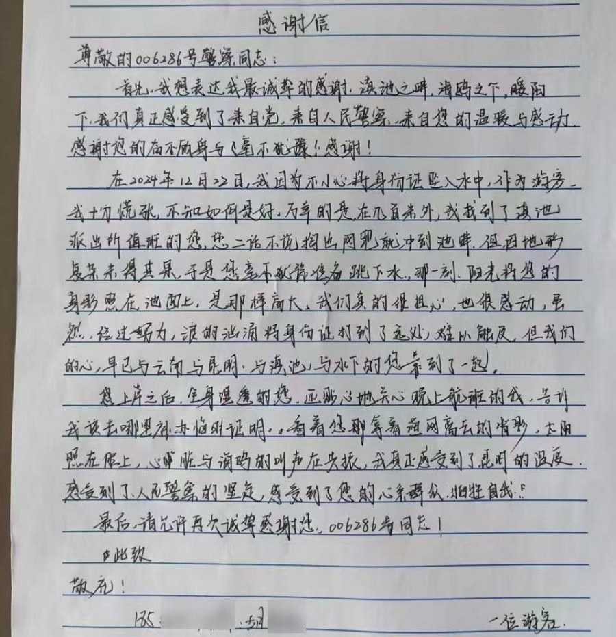 “浪的汹涌将身份证打到了远处,但我们的心早已与昆明、与滇池,与您,靠在了一起……”不久前一位来昆明旅游的游客以书信的方式向昆明市公安局水上治安分局滇池水上派出所辅警杞富裕表达感谢。