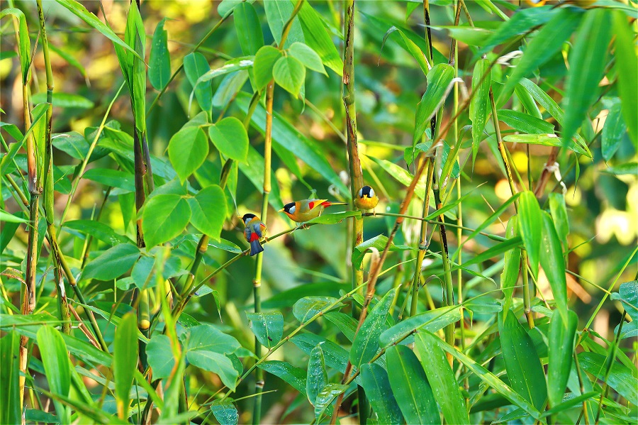 色彩各异的鸟儿或停留在枝头享受着暖阳,或蹦跳于枝间抖动着尾巴起舞,或穿梭在花朵间尽情地吮吸花蜜……鸟儿与山花相映成景,让人沉醉。(完)(郁云江 侯云鹏)