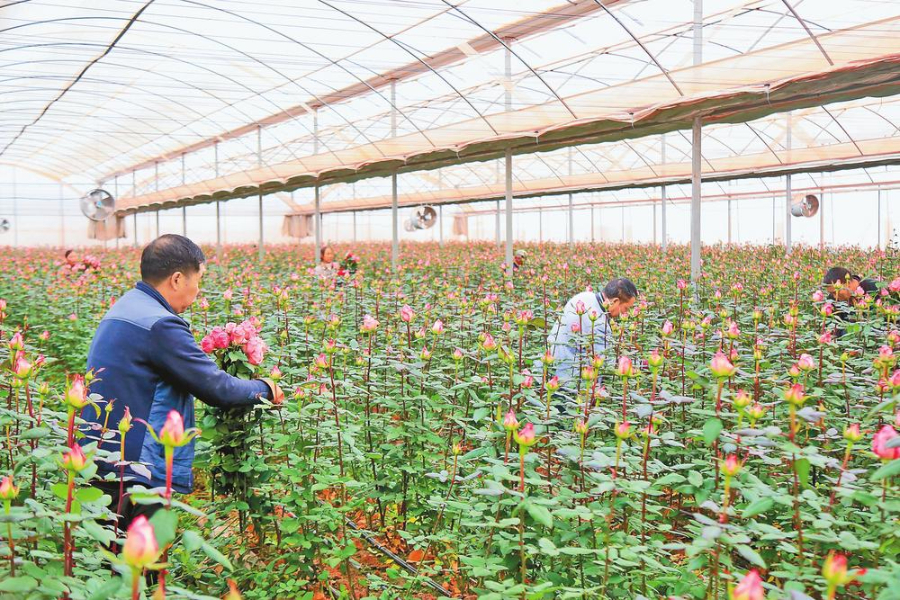 春节期间,师宗县彩云现代花卉农业产业园的鲜切花迎来了销售高峰。产业园的大棚里,一株株玫瑰花竞相绽放,种类繁多的玫瑰花争奇斗艳。彩云镇拨云村的花农郭永辉夫妇穿行在大棚中,熟练地采摘鲜花。这两年,郭永辉夫妇和附近其他村子的不少农户都到基地务工。“我们夫妻都在花卉产业园务工,一年的工资共有10多万元,还能照顾家里。”郭永辉说。