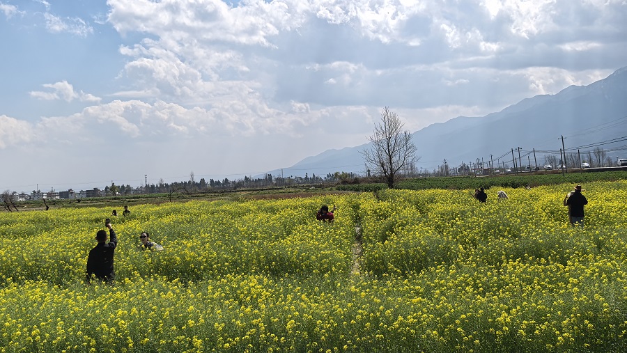 近期,走进大理白族自治州大理市银桥镇磻溪村,一片片金黄的油菜花海在阳光下显得格外明艳动人,吸引众多游客拍照“打卡”。身着“大理烟草科技小院”字样服装的工作人员也穿梭其中,他们并不是去赏景拍照,而是去“烤烟+玉米+油菜”一年三熟模式的试验示范田观察田间长势。