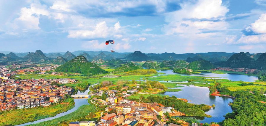 图为游客搭乘动力滑翔伞,从高空观赏普者黑秀美风光。