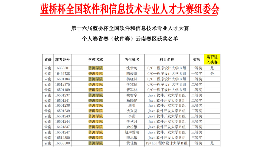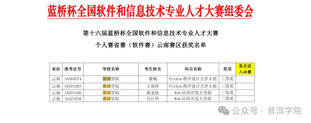 近日,第十六届蓝桥杯全国软件和信息技术专业人才大赛省赛(云南赛区)获奖名单揭晓。普洱学院41名学子在电子类与软件类竞赛中脱颖而出,共斩获一等奖4项、二等奖12项、三等奖25项,获奖总数及参赛规模均创校史新高。沈伊甸、黄佳俊、张纯鳞、陈峻豪4位一等奖获得者将代表学校出战全国总决赛。