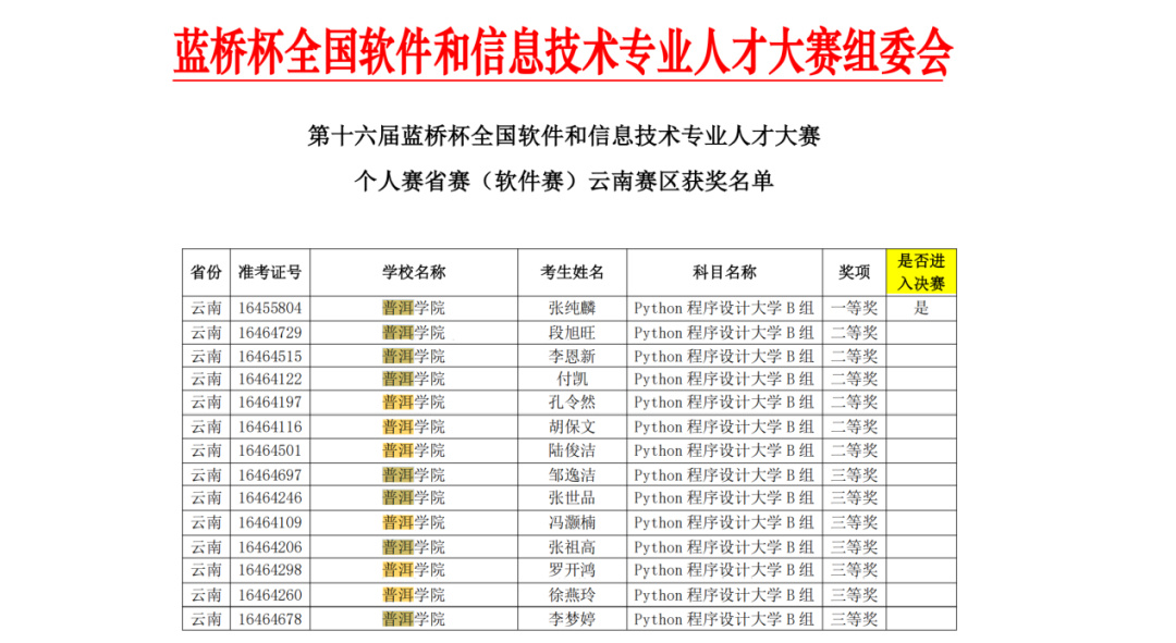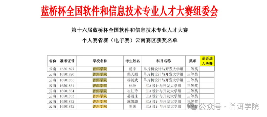近年来,普洱学院已在“蓝桥杯”等A类学科竞赛中累计获得百余项奖项。作为祖国西南边疆民族地区一所“国门大学”,普洱学院持续深化“产教融合、实践育人”办学特色。通过建立“学科竞赛+人才培养”双轮驱动机制,将行业前沿技术标准、企业真实项目案例融入教学体系,重点强化学生工程实践能力和创新思维培养。下一步,普洱学院将进一步加快推进“新工科”建设,持续完善智能制造、大数据等领域的实训平台建设,着力培养契合区域产业转型升级需求的高素质应用型人才。(普洱学院 供稿)