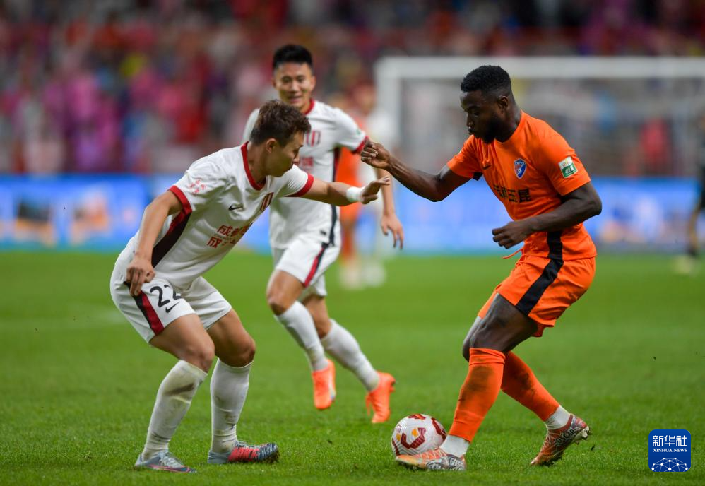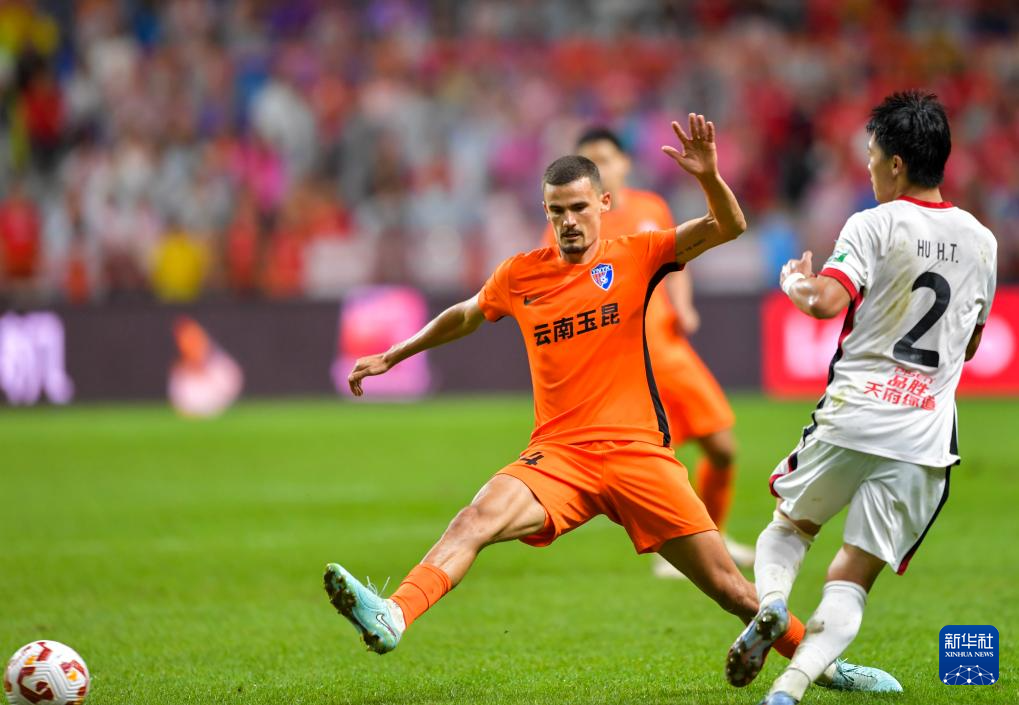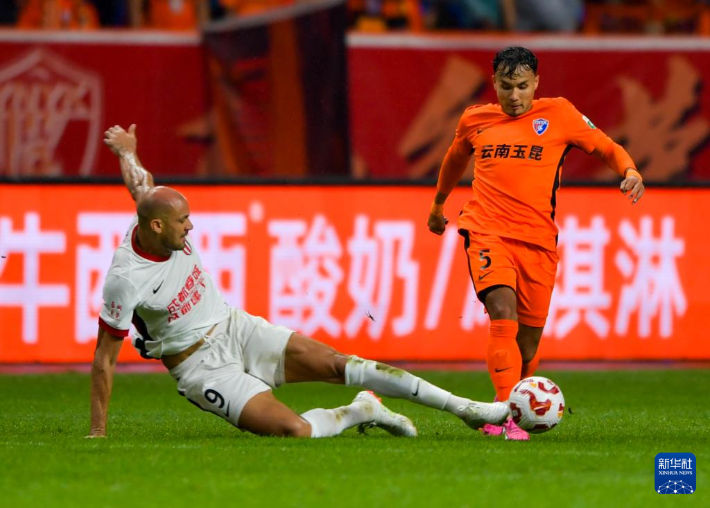 8月23日,云南玉昆队球员内内(左)与成都蓉城队球员胡荷韬在比赛中拼抢。新华社记者 陈欣波 摄
