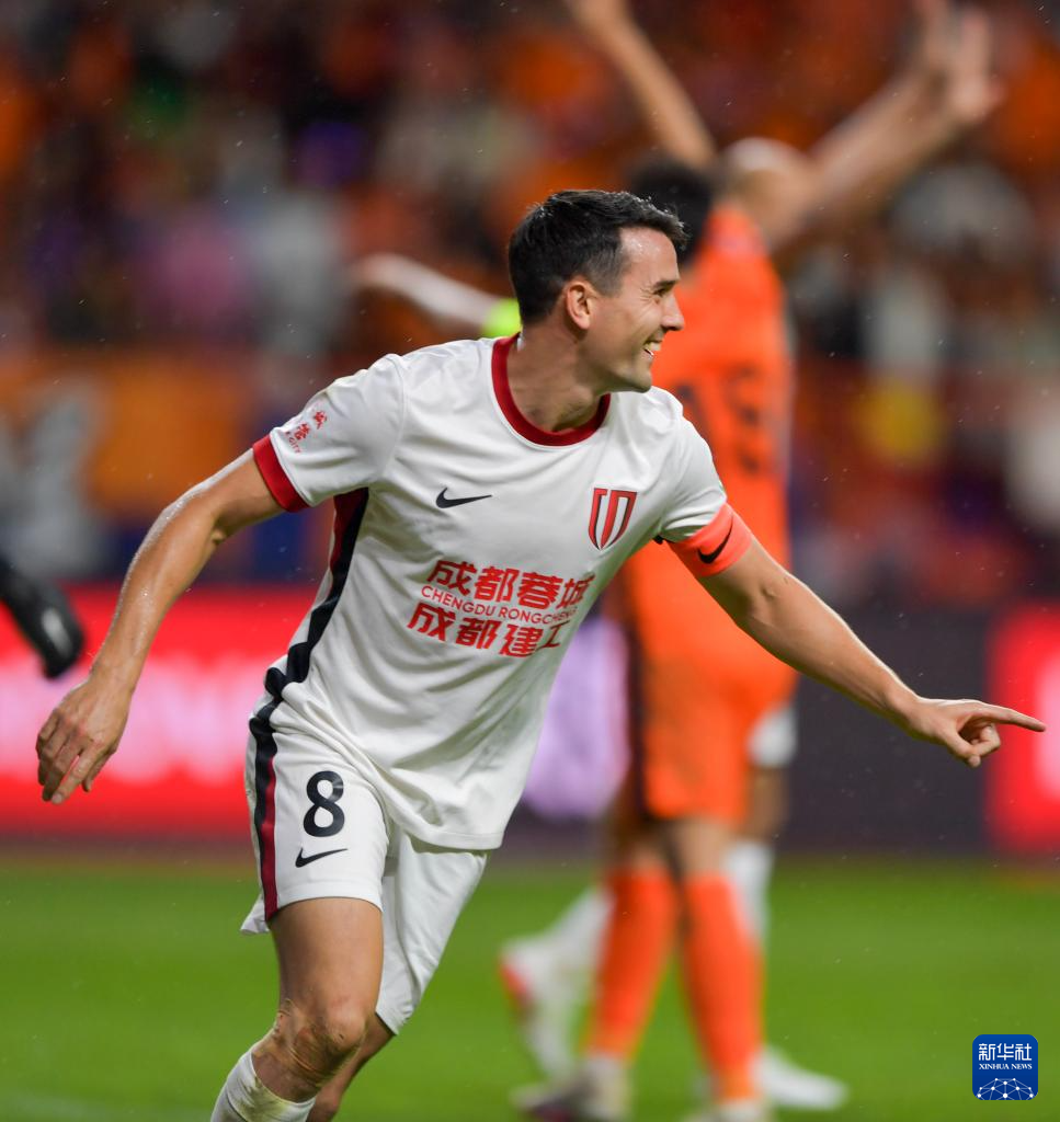 8月23日,成都蓉城队球员周定洋在比赛中庆祝进球。新华社记者 陈欣波 摄