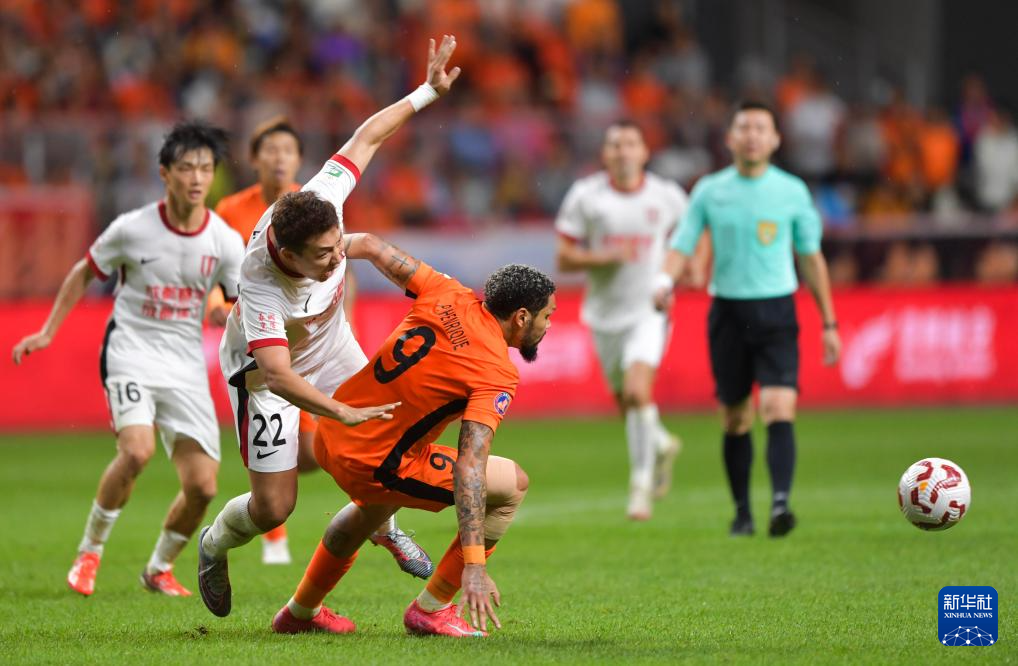8月23日,成都蓉城队球员费利佩(左)在比赛中铲球。新华社记者 陈欣波 摄