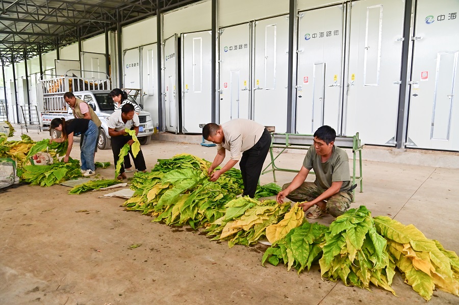烟农正在分级烟叶(8月14日摄)。