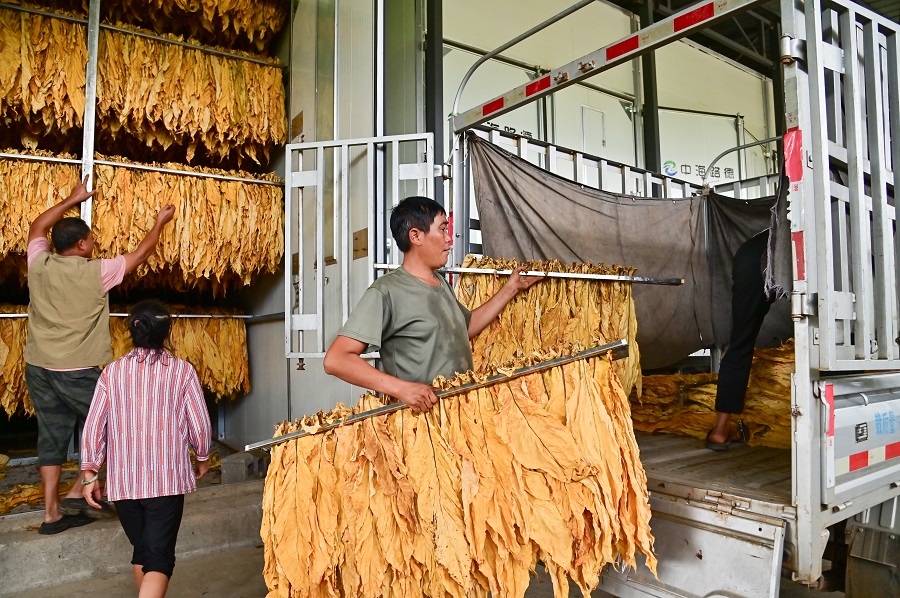 烟农正在出炉烤好的烟叶(8月14日摄)。