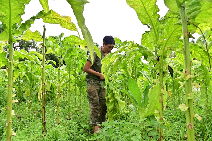 烟农赵兴础正在采烟(8月14日摄)。