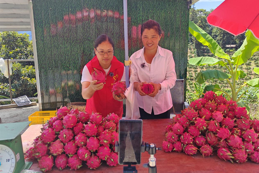石维双(右一)与麻栗坡县烟草专卖局客户经理直播介绍火龙果(9月20日摄)。