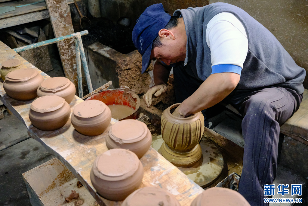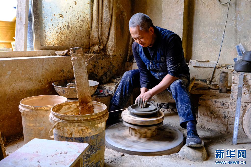 工人手工拉坯,准备制作传统土陶产品(9月29日摄)。新华网发(张洪科 摄)