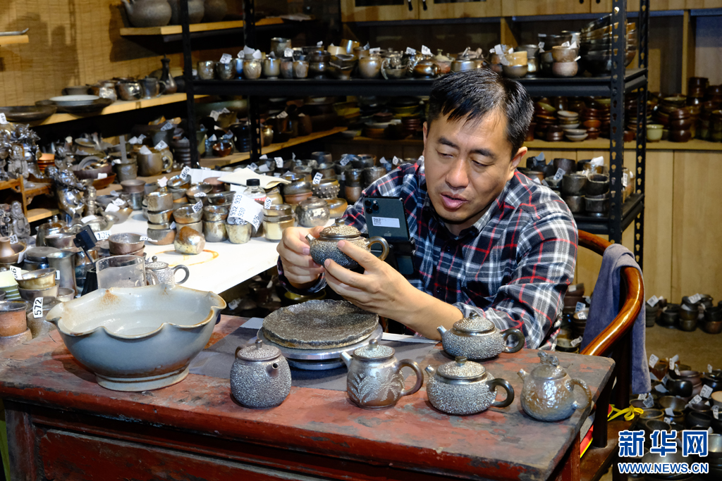 当地企业采用直播形式介绍土陶茶具特性,销售产品(9月29日摄)。新华网发(张洪科 摄)