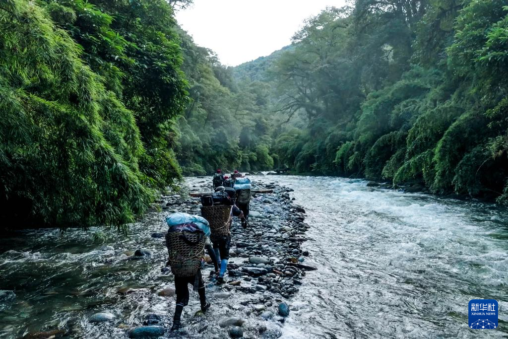 界务员们背着大包徒步前往中缅39号界桩。新华社发 褚建伟摄