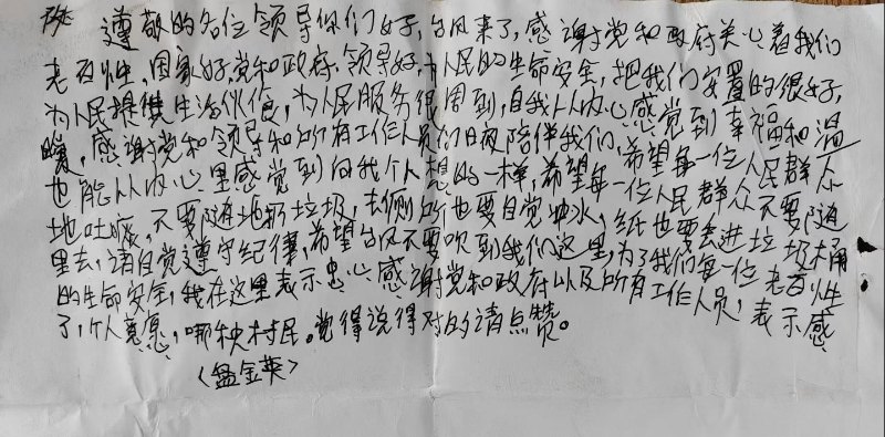 而10月7日那封手写感谢信递到手中,让金鑫和同事们红了眼眶,信中写道:“希望每一位人民群众不要随地吐痰,不要随地扔垃圾,去厕所也要自觉冲水,纸也要丢进垃圾桶里去,请自觉遵守纪律”“感谢党和政府及所有工作人员......”一字一句印证着同心协力的力量。“从冒雨协助每家每户撤离,到见证安置点里邻里间的互帮互助,那些瞬间都铭刻在我们心中,信中的话语,是对我们工作的莫大肯定,是激励我们前行的力量,更是一场家园的共同守护。”金鑫在朋友圈里写下这样的感慨。