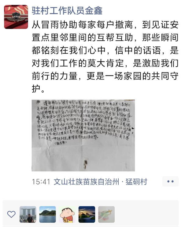 风雨早晚会渐歇,阳光会重现。那张手写感谢信,被金鑫小心翼翼地收了起来,成为他心中最珍贵的“勋章”。在文山,还有无数党员干部在这场风雨中逆行,在守护中坚守,用脚步丈量责任,用行动传递温暖。而群众的认可与回应,也化作他们继续前行的动力,让“为人民服务”的誓言,在一次次守护家园的行动中,变得更加坚定而滚烫。(记者:郑泽娅 麻栗坡县猛硐瑶族乡驻村工作队)