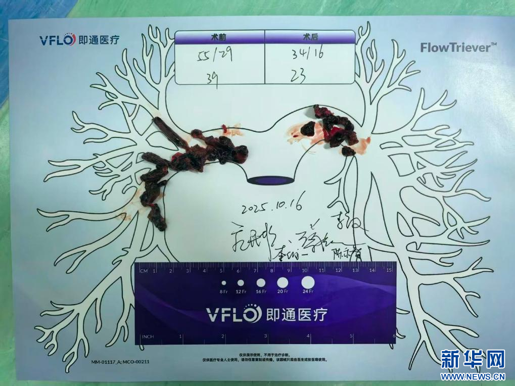 手术过程中,心脏大血管外科团队精准操作取栓系统,使用8mm粗细的导管安全进入患者的右心房,穿过三尖瓣,经过右心室出口直达患者的肺动脉主干,迅速取出肺动脉内的大量急性、亚急性血栓。同时使用血液回输系统,将抽吸出的大量血液分离、清洗,并及时回输至患者体内。此举在清除血栓的同时显著减少患者因手术导致的自身血液丢失,全过程未额外输注其他血制品,患者失血仅约150毫升。
