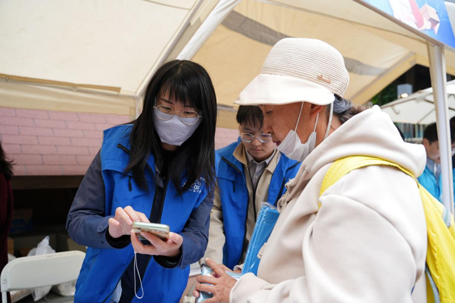 工作人员教群众在手机上办理社保业务(10月23日 摄)。