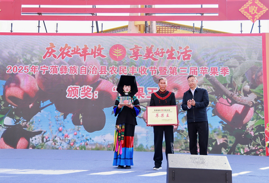 本届丰收节暨苹果季以“以节为媒、以果传情”为核心,展现了宁蒗县的产业活力与文化风貌。开幕式上,首批“宁蒗苹果推介官”获颁证书;郭万华、阿余长发等人获评“产业大户”和“致富能手”称号;来自新营盘乡毛家乡村委会的果农沙长发凭借40年的苹果种植经验,所种植的苹果摘得第三届“苹果王”称号。