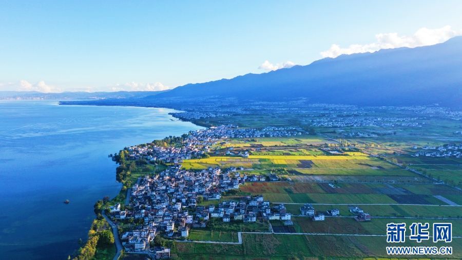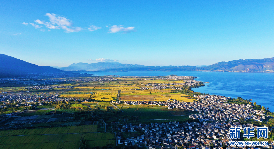 大理洱海、村庄、稻田相映成景(10月25日摄)。新华网 赵普凡 摄