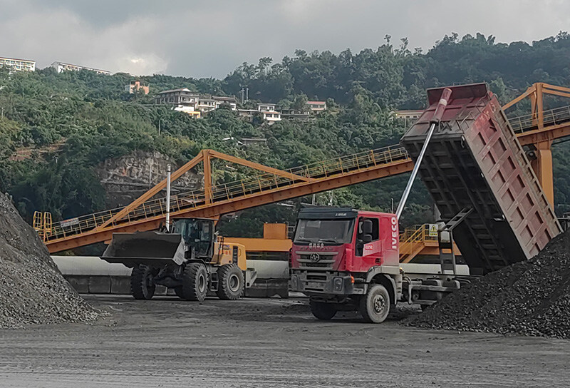 水富港中嘴作业区,货车、装载机正在进行磷矿装船作业。