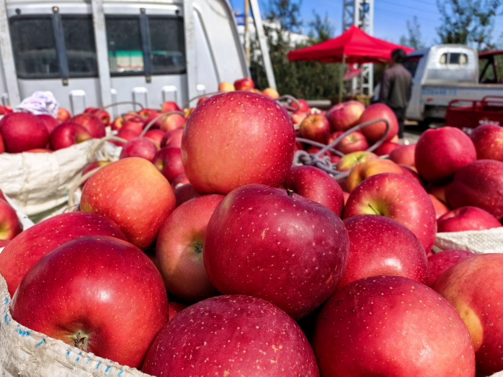 图为:果农采摘苹果装运(昭阳区融媒体中心供图)