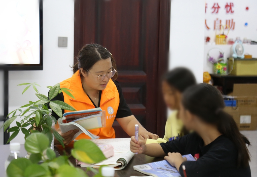 社工上门辅导孩子做作业(9月13日摄)。