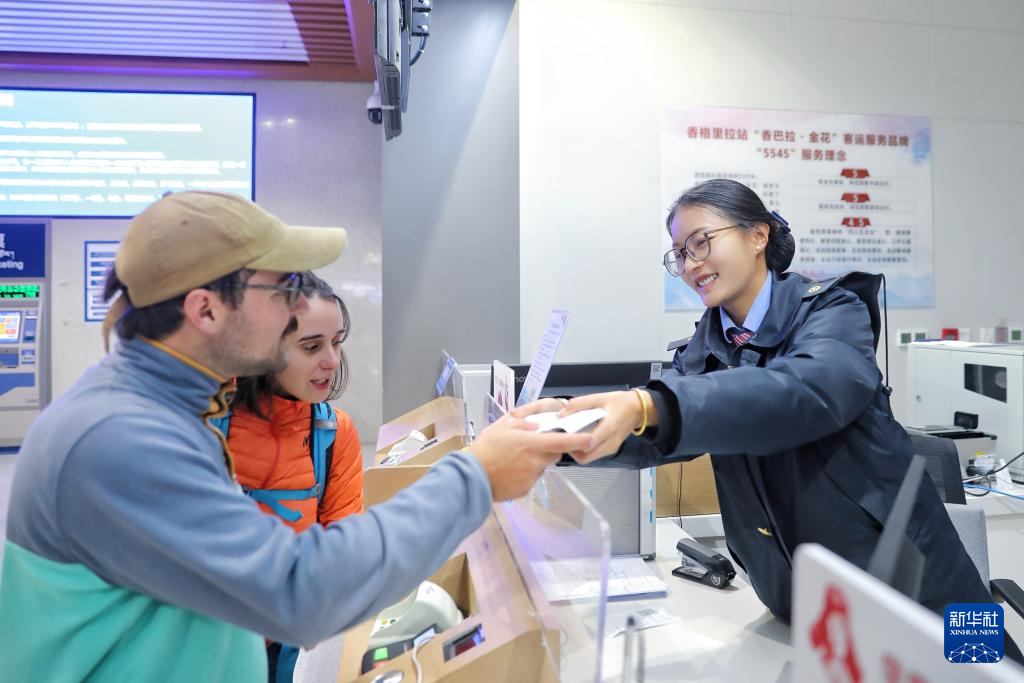 11月18日,外籍旅客在云南香格里拉站“香巴拉·金花”服务台购票。车站为旅客提供“一站式”出行服务。新华社发(杨紫轩摄)
