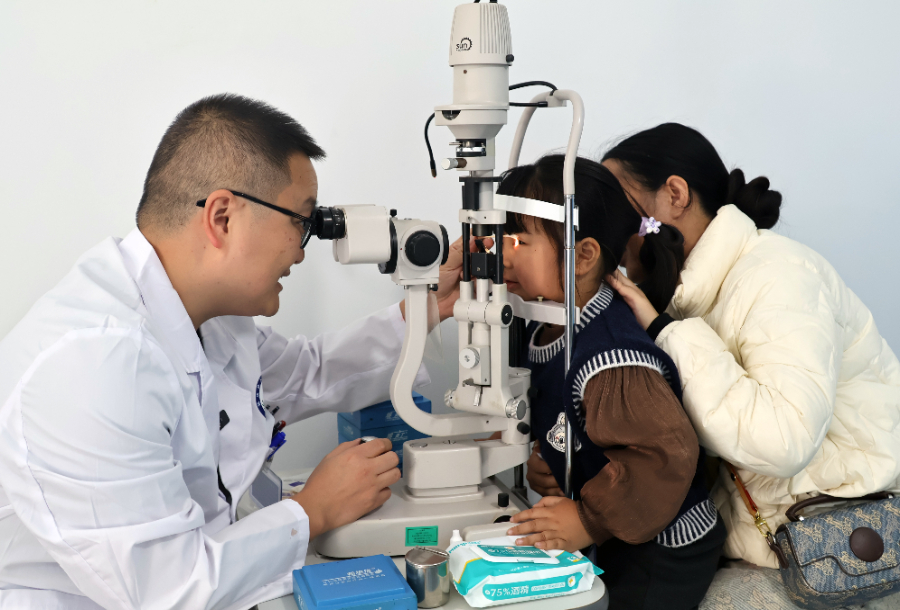 临沧市人民医院下派眼科医生王伟为患者做检查(11月30日摄)。