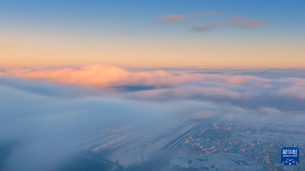 冬日,朝阳洒落,昆明市晋宁区滇池南岸的山水城野之间频现云海景观。