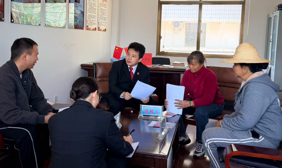 保山市隆阳区人民法院法官在潞江镇新寨村委会组织调解(12月9日摄)。王睿敏 摄