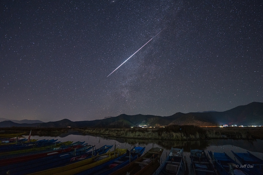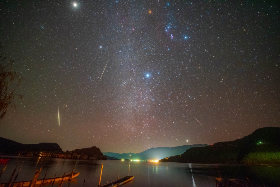 一颗火流星划过泸沽湖的夜幕,湖光山色间尽显宇宙的深邃(12月14日摄)。戴建峰 摄