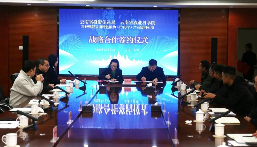 云南省投资促进局与云南省农业科学院进行战略合作签约(12月26日摄)。
