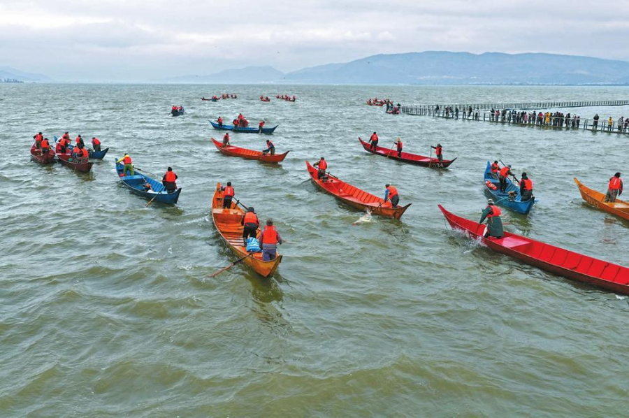 12月25日12时,随着发令枪响,40艘渔船从星云湖望海码头起航,“滇国故里·鱼跃星云”江川第18届开渔系列活动正式启动。本届开渔系列活动将持续至2026年1月10日,包含文艺演出、跨年晚会、烟花表演、无人机表演、商贸展销等。云南李家山青铜器博物馆专题展览和古玩集市同步举行。(记者 王剑钊 摄)
