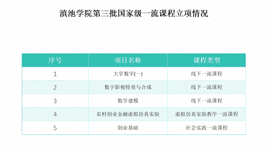 学校5门课程入选第三批国家级一流本科课程。滇池学院“基于北斗的数字化安全管理工程研究中心”和云南省高校“乡村人居环境安全策略”研究科技创新团队顺利通过云南省教育厅验收评估。