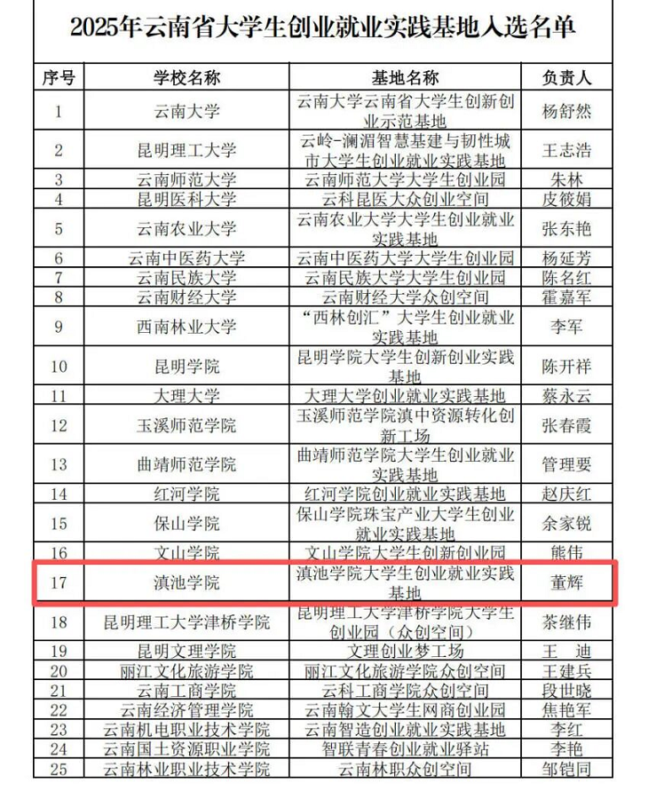 学校入选第二批“全国大学生创新创业就业服务基地”培育建设单位、2025年云南省大学生创业就业实践基地;56个合作项目获教育部批准立项。