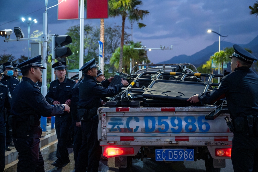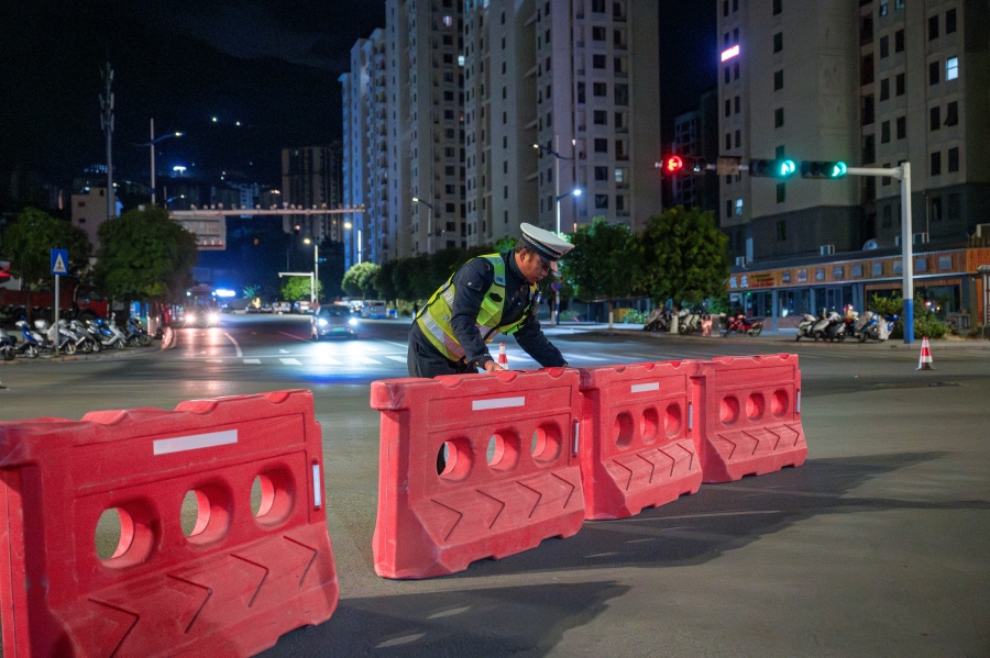 执勤民警正在卸下隔离栏(1月2日摄)。滕昌平 摄