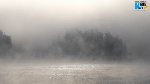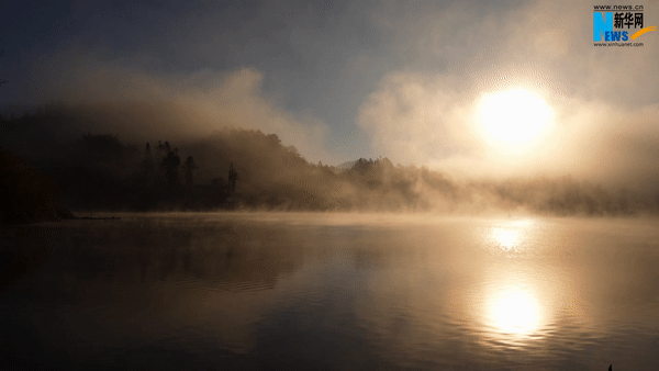 清晨,在云南省保山市龙陵县蚌渺湖,初升的暖阳穿破薄雾,照向湖泊,水天一色,宛如一幅水墨画卷。(周青 王学云)